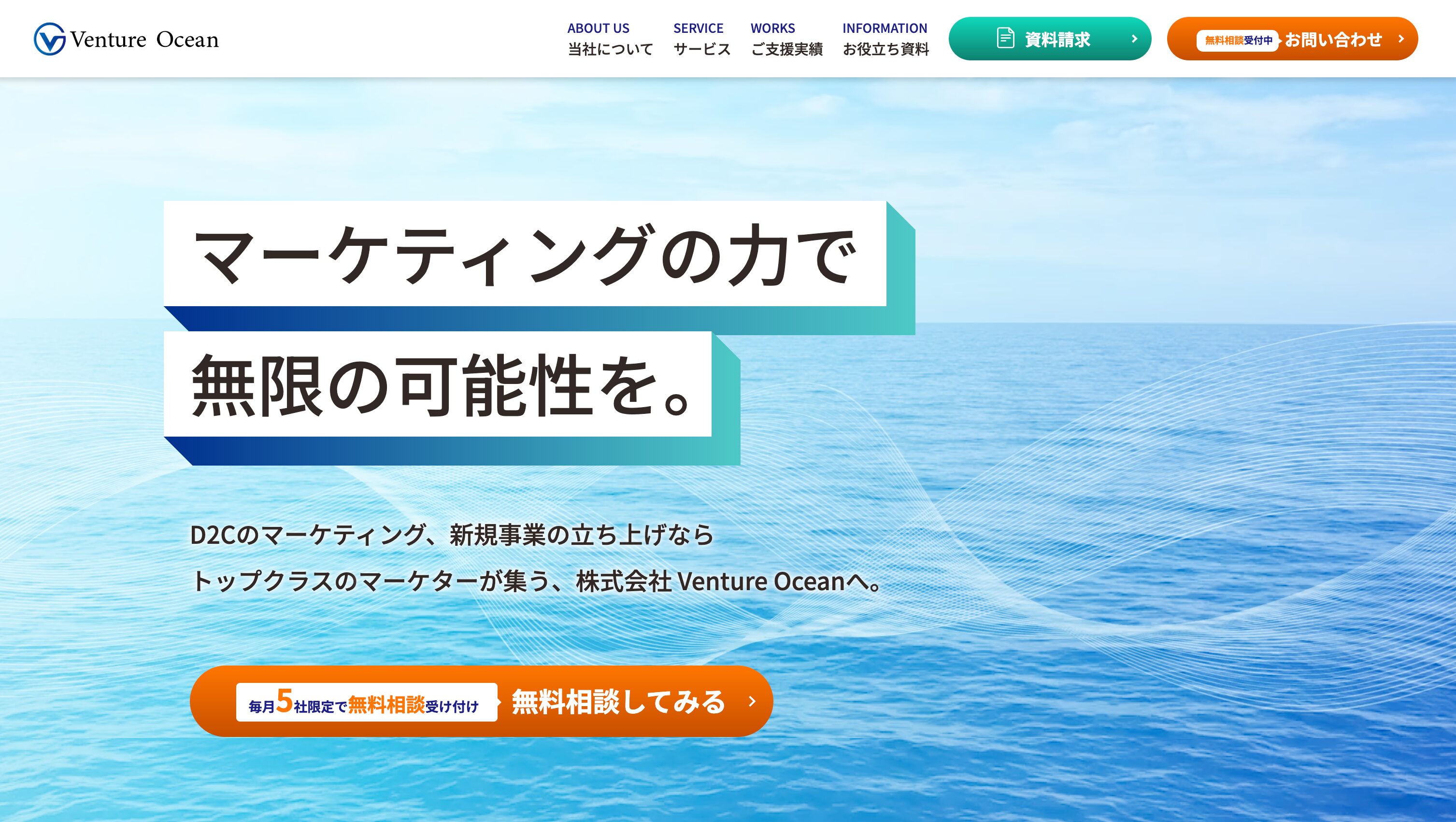 株式会社Venture Oceanは、新規事業やD2Cに特化したマーケティングコンサル会社です。新規事業立ち上げコンサルティング、D2Cコンサルティング、商品開発コンサルティングなどのサービスを行っています。代表は1年で70億のブランドを立ち上げた経験があり、新規事業のプロが集っております。マーケティングでお悩みの方はぜひ一度、ご相談ください。